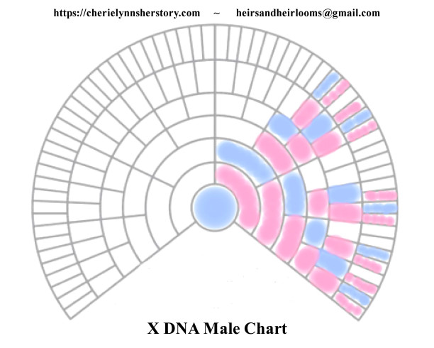 The blue circle is a man this is the man’s, any man’s, x-DNA x-gene chart – of possible X ancestors. You see there is NOTHING from dad’s side. For instance is a man has a daughter – she will get some of that X gene the man got from his mother, and she will get some x from her mother also. But men get NO X and your sons, if any, get no X from their fathers.