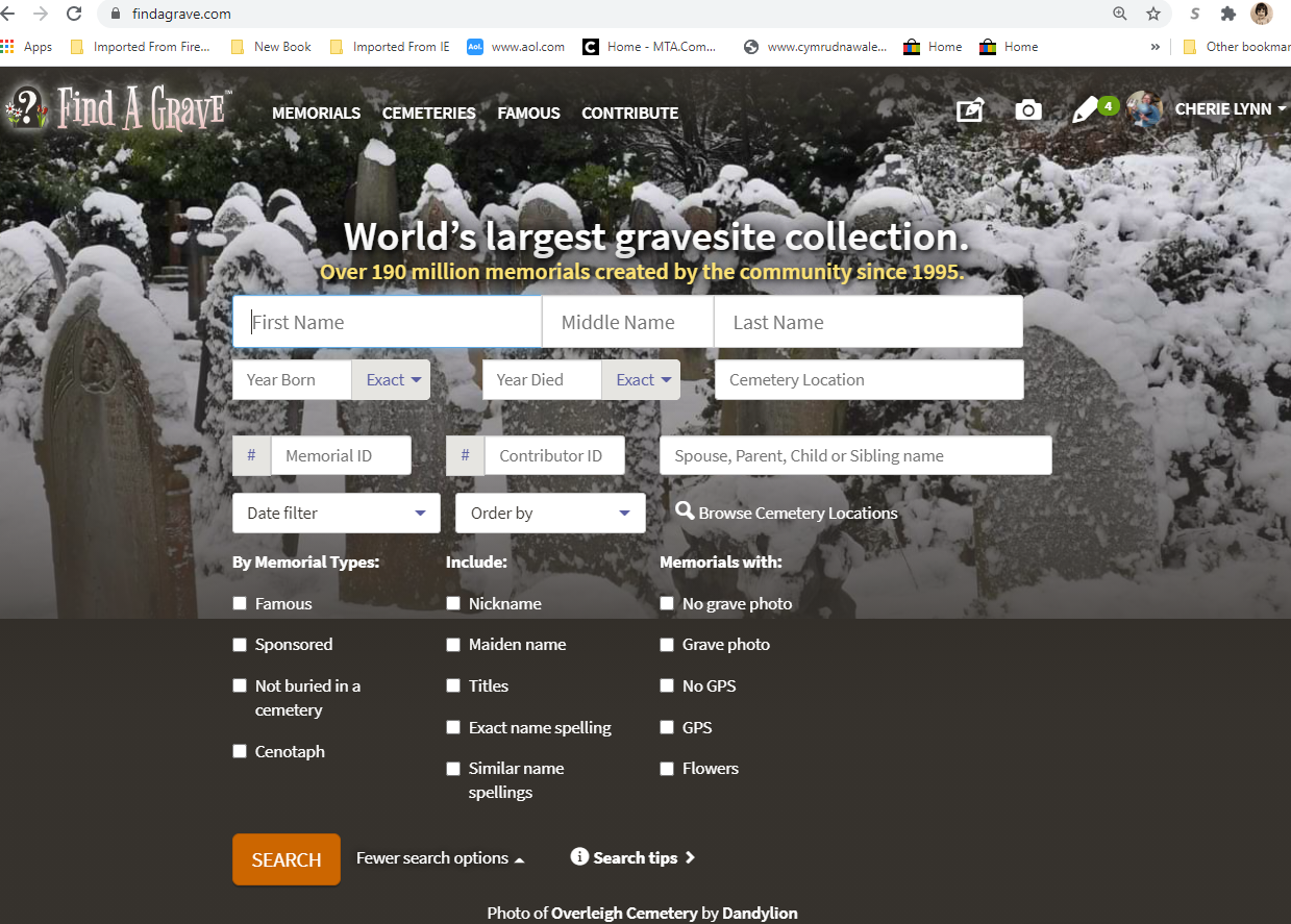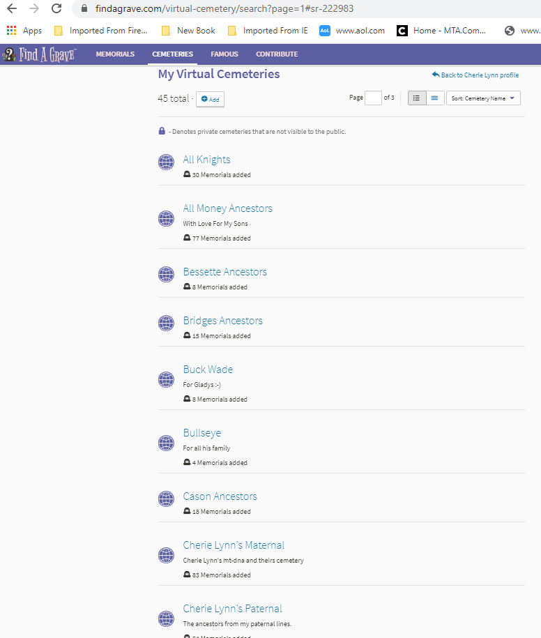 The virtual cemeteries allow you to save your ancestors or memorials of interest to a page. You can name each virtual cemetery page for your own special interest. For instance, I have a Cherie Lynn Paternal virtual cemetery page and a Cherie Lynn Maternal virtual cemetery page. I find and add all my paternal ancestors in one and all my maternal ancestors in another. This way, I only have to go to one page of my own in my profile, to access many ancestors at once. I don’t have to look up each one, every time. I can also send one link to a family member and they can go and easily access many relatives with one click.