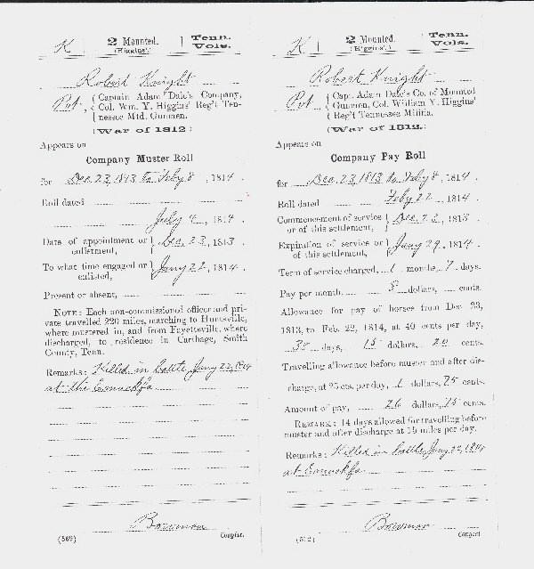 Robert married Mary (Polly) Linder in 1805 and had seven children over the next eight years. Around 1809, a group including both Thomas and Robert moved west with their families and settled in Wilson County, TN. A call went out for volunteers during the War of 1812 and Robert answered it. He became part of the 2nd Regiment of Higgins TN Mounted 90‑day Volunteers – a group that left Nashville in Dec 1813 and headed for Alabama to support General Jackson. On the morning of 22 Jan 1814, Robert was among a few who were killed in a surprise attack by Redstick Indians in the Battle of Emuckfaw Creek. He left his widow Polly, and six surviving children. Two became doctors; one was only 2 years old ‑ our Ancestor T.H. Knight. Maybe his sense of service was an inherited trait. Who knows?