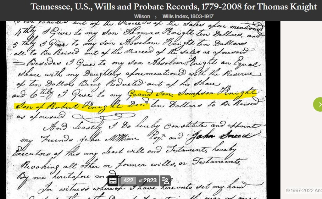 The families have many records and connections. Autosomal DNA clearly shows descendents from Robert Knight and Sarah Simpson Knight who match her Simpson line but do not match the y-DNA of the lines descended from Robert’s brothers. Likewise, other direct male-line descendents from Robert do not match the lines from Robert’s brothers.