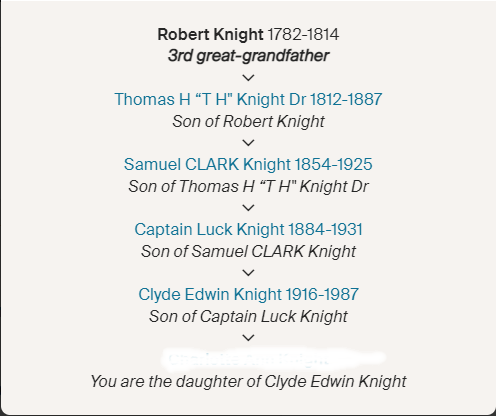 When I use the “shared” match feature with either, I see a range of people from our list of “Knight” relatives that include descendants of our grandfather Captain Luck Knight’s siblings all the way back to descendants of Robert Knight’s children. The list seems to go on and on. I know of no possible interpretation except that Robert Knight’s biological father was Abraham Philips.