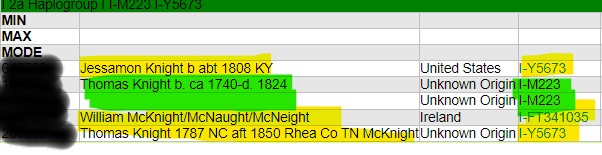 In the beginning – more than five years ago ‑ we were part of a Knight Project. Thomas Knight (1740‑1824) had four sons, and descendants on two of those lines had already taken y-DNA tests. About three years ago, my brother agreed to take his y-DNA test and join the project. He (and I) are descended from a third Thomas Knight son, Robert Knight (1782‑1814). This was exciting. But when his results came back, we were stunned. He did not match the others! He was not even in the same I haplogroup.