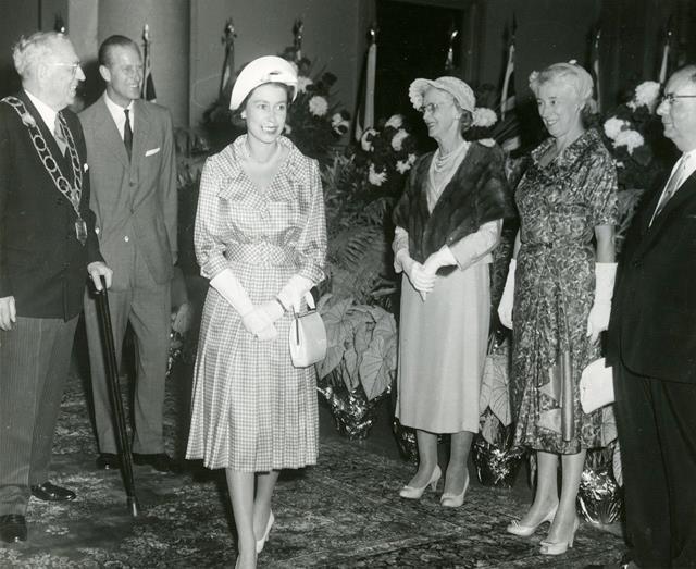 On Thursday, July 2, 1959, dressed in a red check dress and a white hat, Queen Elizabeth II and Prince Philip arrived by train at the Canadian National Railway Station on Stuart Street at 10:01 am. Accompanying the Royal Couple was the Hon. Ellen Fairclough, Minister of Citizenship and Immigration.