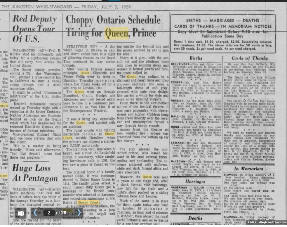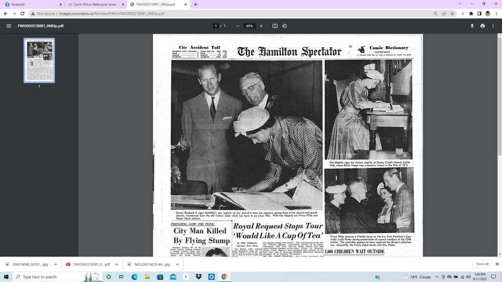 Wonderful history to be found online via fun websites, newspapers, historical photographs and homespun memories. Homespun by my Dai for this memory to honor the Queen. In 1959, Dai was in the Stoney Creek Cubs and his group were part of the honor guard when Queen Elizabeth II and Prince Philip visited Stoney Creek Battlefield Monument. I nudged him for a memory.