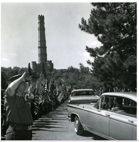 I don’t know why all the American flags; this might have been a Boy Scout troop from Buffalo, just 40 miles east of Stoney Creek. I don’t remember much about the visit except that we stood there for a long time in the heat and my feet got sore. We did get a glimpse of her through the car window as the procession of vehicles wended up the driveway toward the monument. We waited for what seemed like a long time and then the cars came back down and we craned for another peek.