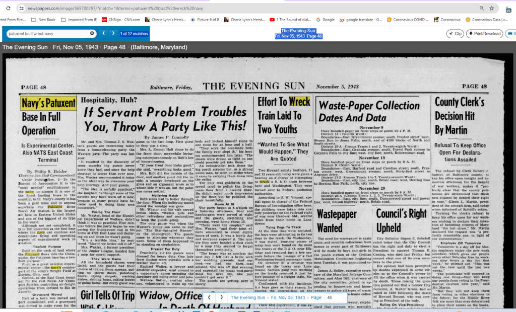 Our summer 2024 mini story of southern Maryland is about my father, Samuel Harry “Sam” Knight Jr. 80 years ago this year, in 1944, while stationed at the Patuxent base he was driving a boat up the river and he wrecked the boat and wound up in the hospital. I still can’t find much in the way of details and hope one day a local newspaper might come online, that likely carried the story and might give us some clues. The photo is Sam and his best friend Jack.
