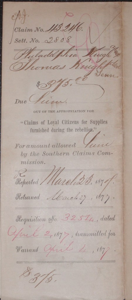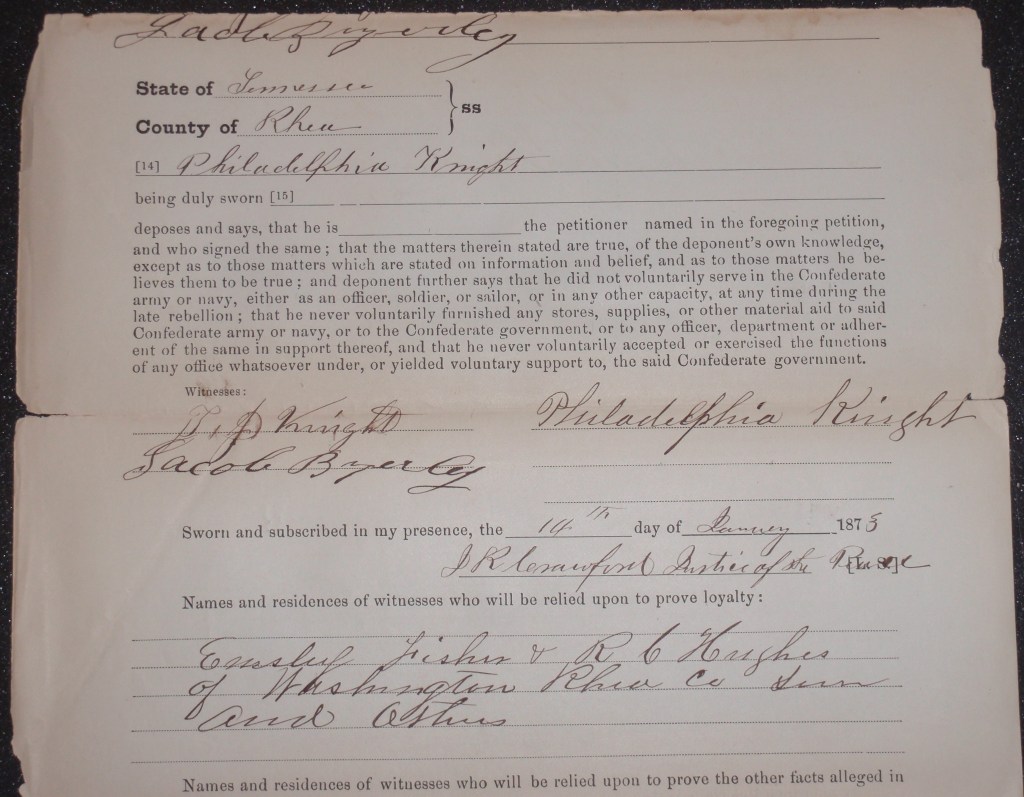 Delphia would have loved the book The French Broad – she would have known countless of the families – The only mention of the Knights in the book is Mary – but which Mary remains to be seen. Delphia’s photo from Virginia Knight Nelson’s book Rhea County Families. Don’t you just love signatures! This tells us if one could write or used an X. Her penmanship is better than mine. These are from her records from the Southern Claims Commission that she lost money in the war and it is stated and vouched that she did not support the confederates. Last Baylis and Sarah who seemed to be much the teller of history to Paw.