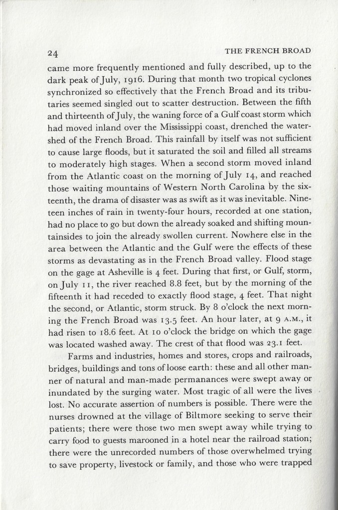 Wilma Dykeman in her magnificent book The French Broad writes about the floods. On pages 24 and 25 she speaks of the great flood of 1916.