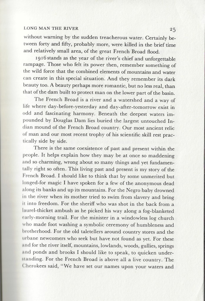 “…and you cannot wash them out.” They were right – the Nolichucky and the Swannanoa and the Estatoe (as well as the French Broad) but they might also have said, for all of us, “We have lived our lives along your rivers and you cannot wash the memory of us out. P. 26