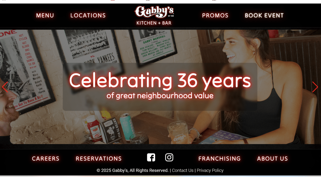 “…Gabby’s was founded in 1988 by a local Toronto family, opening our first location in March 1989. From day one, we aimed to create a cozy, welcoming environment where guests could enjoy freshly cooked meals, great draft beer, and an extensive selection of spirits—all while watching major sporting events. More than 35 years later, Gabby’s has grown into a beloved casual dining spot, serving over 45,000 people a week across our 14 locations in Toronto…”