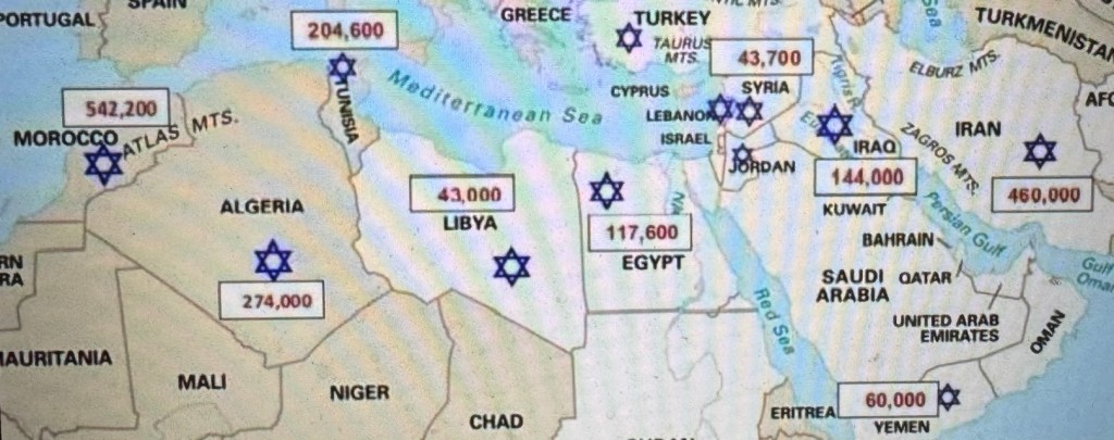 The point of this map is to illustrate some of the national history for the ancestry of some of the Jews (and some Arabs) in Israel, the holy land, Palestine, whatever one wishes to call it, there are Jews from over 100 countries – including these noted Arab countries and more.
